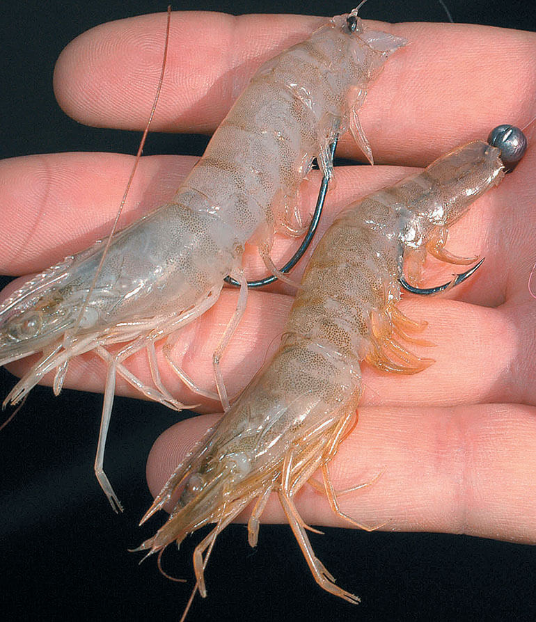 Fresh shrimp come in handy, too, wherever redfish get fussy on grassflats, or around shallow oyster bars. The scent does the trick, and the best vehicles include jig heads (or fully dressed jigs) and weedless spoons. A fresh shrimp either Texas-rigged or tail- hooked is deadly when sight casting to redfish in tailing depths.