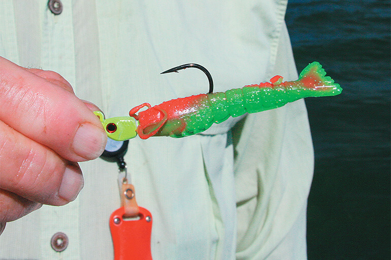 This category of soft plastics is more popular now than ever, and it covers finfish, shrimp and crabs—the entire redfish food group. Swimbait mainly refers to those lifelike mullet/whitebait imitations fitted with a weighted hook. I have had success on pass and mangrove backcountry redfish with the Storm Wildeye Swim Shad, and the same type of swimbait is a great choice for catching an inshore slam. The smallest versions are light enough for flats work, the bigger ones better suited to deeper water. These ride hook-up in the water making them ideal for bottom-bumping around oyster bars or flats potholes, and most have tails designed to vibrate on a straight retrieve. As the category suggests, these swim on their own without much added manipulation from the angler.